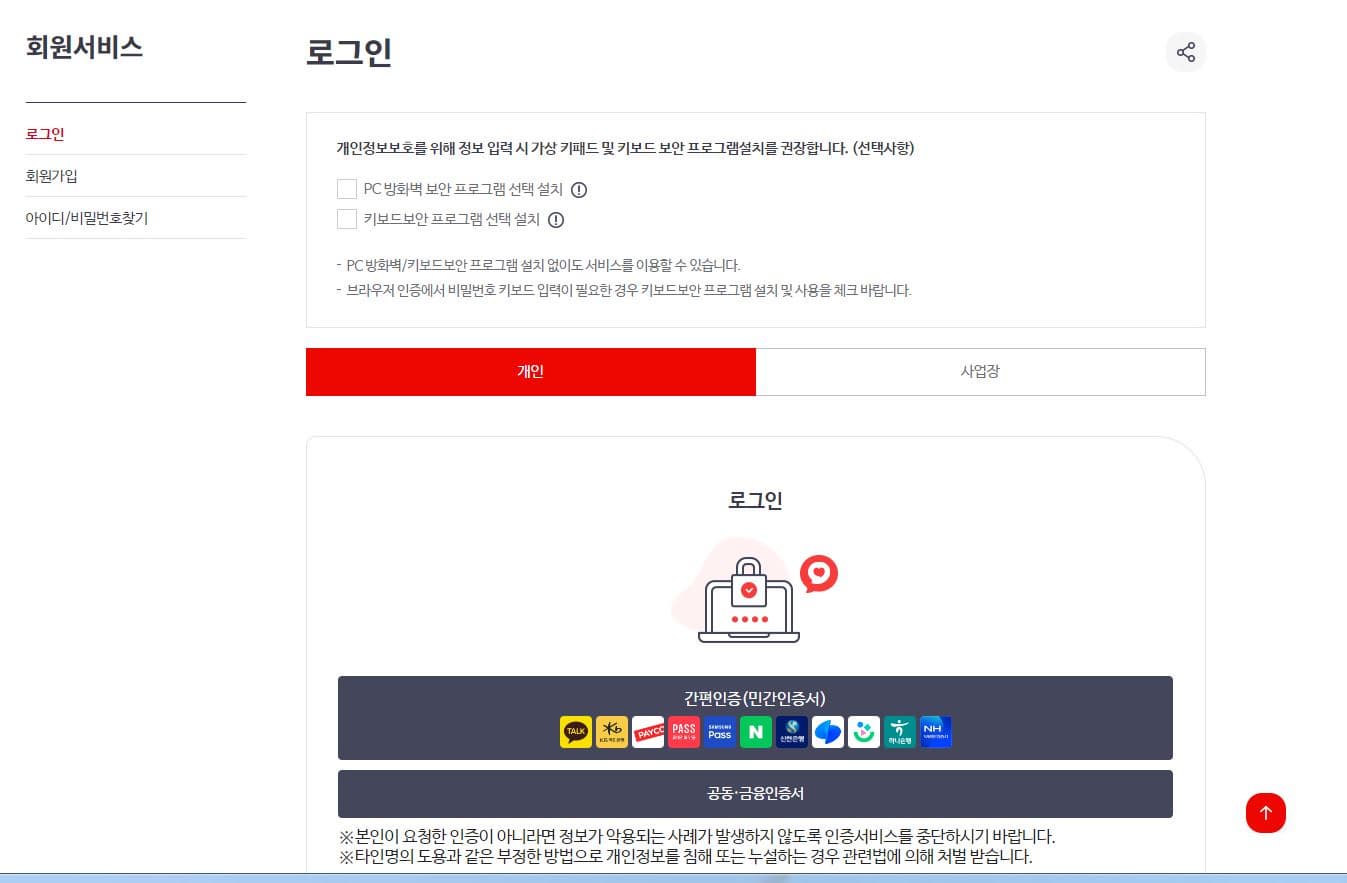 ④ 로그인 화면이 뜨면 ,가입은 필요 없고 본인인증이 필요하니 네이버나 카카오톡으로 간편 인증을 진행합니다.